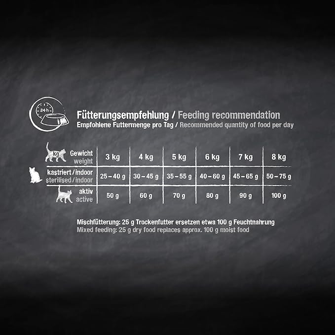Die Kombination aus frischem Fleisch, Gemüse, Kräutern, Beeren und funktionellen Superfoods sorgt für eine ausgewogene, leicht verdauliche Mahlzeit. Zutaten wie Cranberries, Chlorella‑Algen und Chiasaat unterstützen das Wohlbefinden Deiner Katze und tragen zu einer ganzheitlichen Ernährung bei. Die Rezeptur orientiert sich am natürlichen Fressverhalten von Katzen und bietet eine hervorragende Verträglichkeit – ideal für anspruchsvolle Stubentiger und aktive Freigänger.